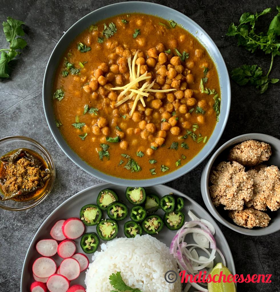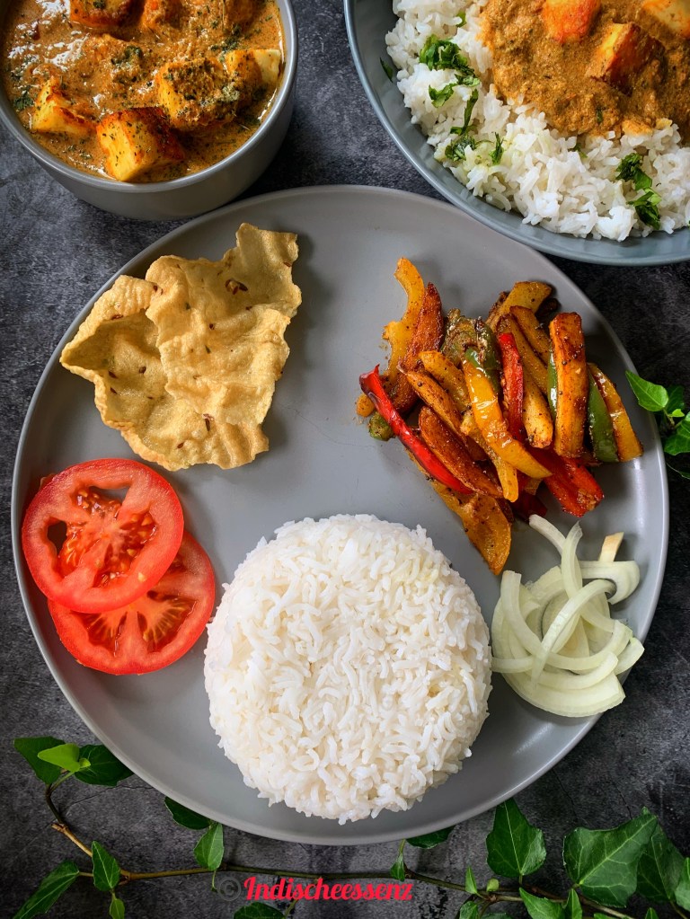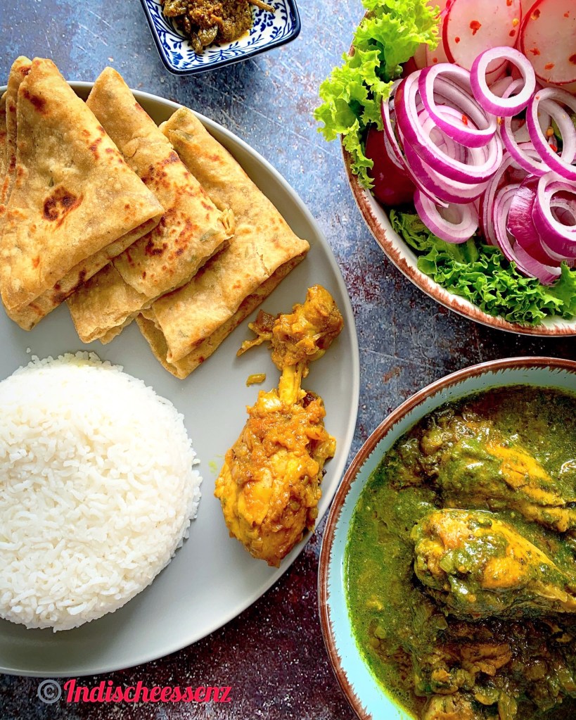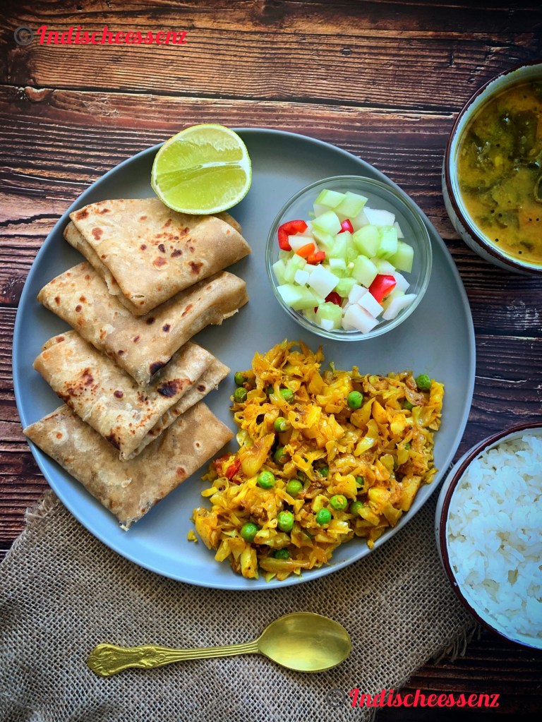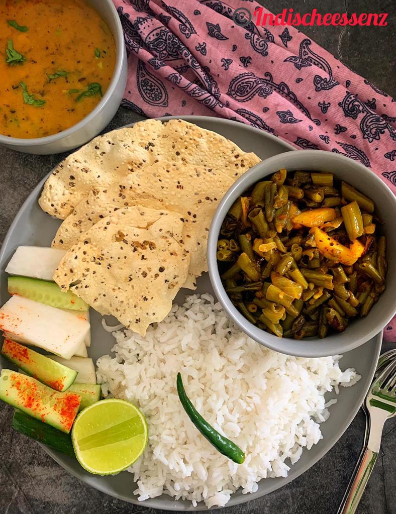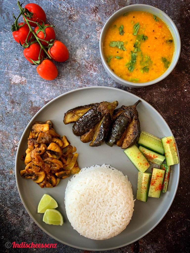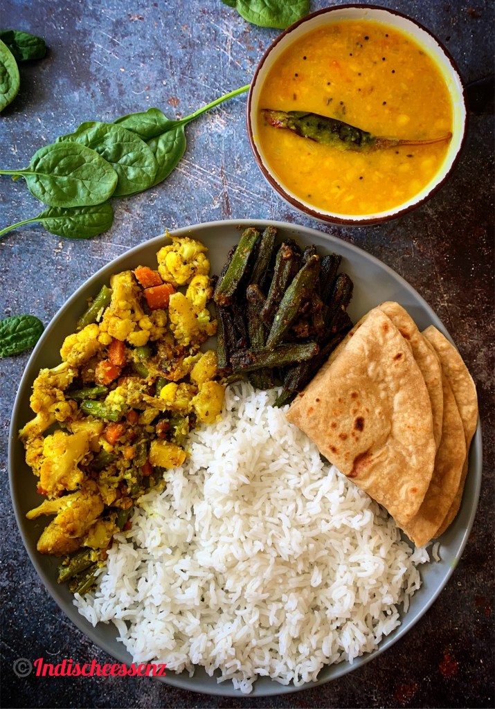 Roti und Reis sind zwei grundlegende Kohlenhydrate, die zusammen mit Linsen, Currys und vielen weiteren Beilagen zu einer täglichen indischen Mahlzeit gehören. Wir essen immer einfachen Reis mit einer Soße. Ein Dal, Dalma oder Sambar ist normalerweise eine Linse, die der Proteinteil einer Mahlzeit ist. Auch gibt es eine Vielzahl von Gemüse, lokale Produkte für die tägliche Mahlzeit. Die Gemüsebeilagen oder grünen Blattbeilagen enthalten viele Ballaststoffe, Vitamine und Mineralstoffe. Dies scheint 4-5 Artikel zu sein, aber jedes Gericht hat einen sinnvollen Zweck und trägt zu einer ausgewogenen Ernährung bei.