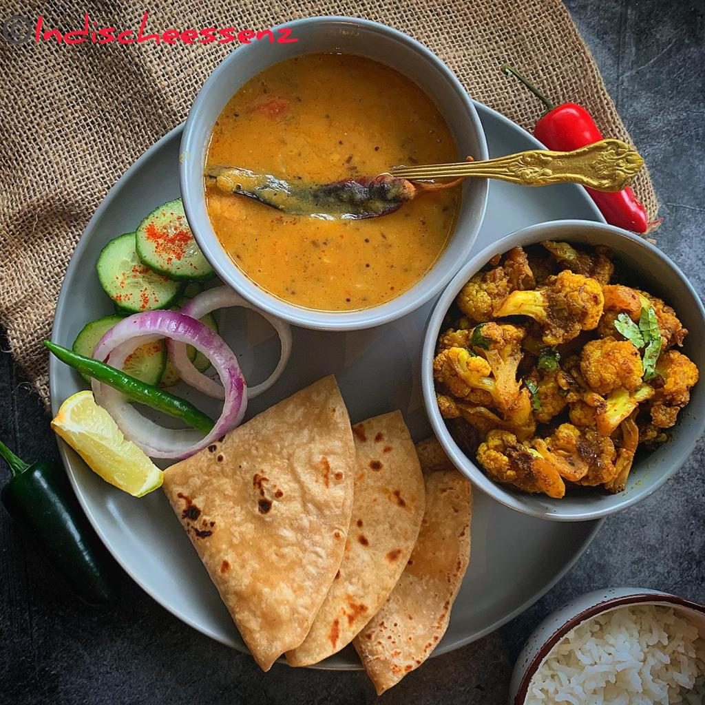 Roti, Dal, Gobi-Aloo fry, cucumber and onion slices !