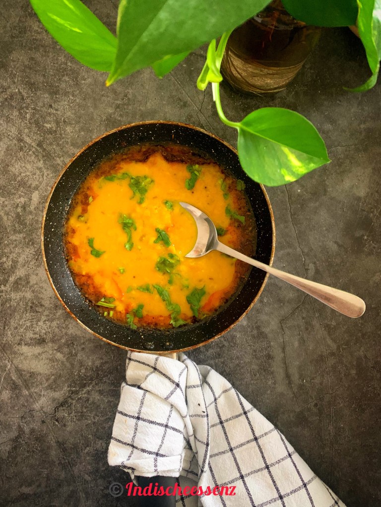 Zum Temperieren 1 EL Öl in einer kleinen Pfanne erhitzen, etwas Senf und Kreuzkümmel ausstäuben. Fügen Sie eine trockene rote Chili, eine Prise Asafoetida, eine Prise rotes Chilipulver hinzu. Rühren Sie es 30 Sekunden lang und gießen Sie es in den Dal. Alles gut vermischen. Mit einigen frisch gehackten Korianderblättern garnieren.
