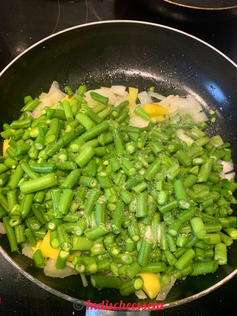 Das Bohnen-Kartoffel-Frittieren ist einfach mit nur Salz, Kurkuma und 1/2 Löffel Chilipulver!