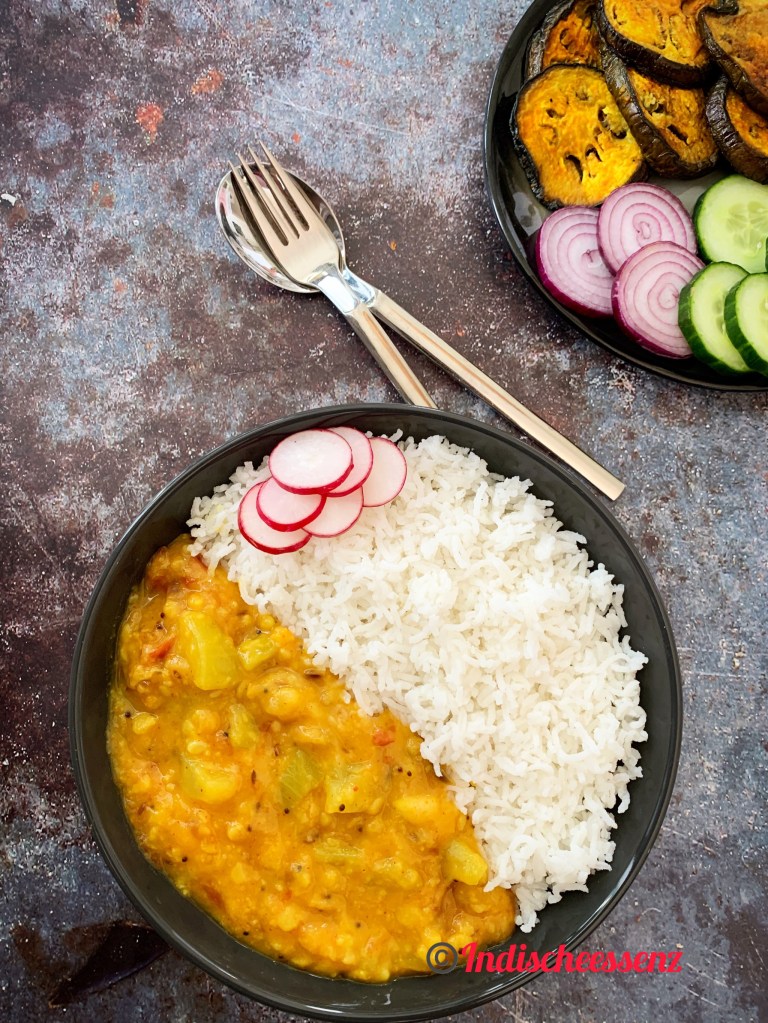 🍛Auf meinem Teller: Reis, Kürbis Linsen, gebratene Auberginen und frische Salate