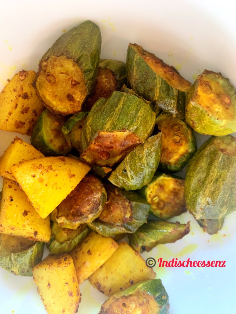 2 Esslöffel Öl in einem Wok erhitzen, Parwal und Kartoffel, Kurkumapulver und Salz hinzufügen. Bei starker Hitze anbraten, bis sie hellbraun sind. Beiseite stellen.